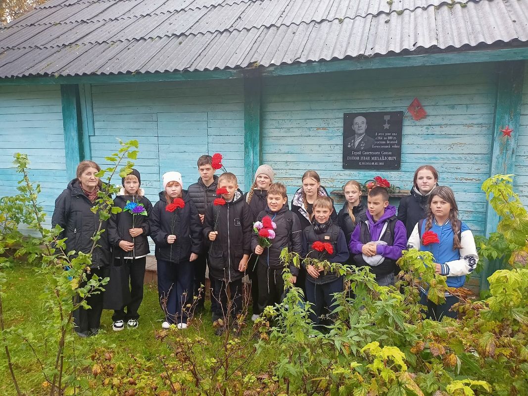 Ребята вместе с учителями Татьяной Владимировной Бузько и Еленой Алексеевной Страшненковой возложили цветы к мемориальной плите и почтили память о Герое Советского Союза минутой молчания.